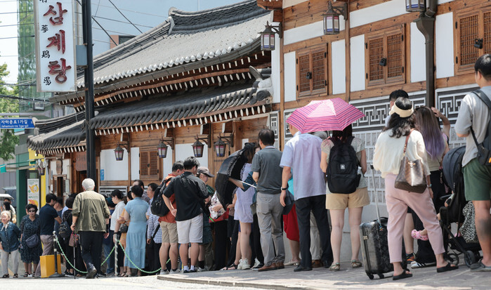 People wait in line to eat "samgyetang," or chicken and ginseng soup with sticky rice and garlic, at a restaurant in Seoul on July 14, 2024. Koreans traditionally eat the dish during the summer to replenish their energy during hot weather. (Yonhap)