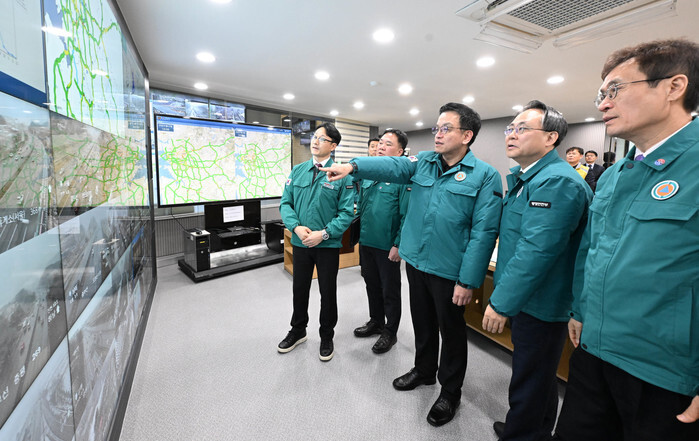 Acting President Choi Sang-mok (3rd from R), who serves concurrently as deputy prime minister for economic affairs and finance minister, points to a screen showing traffic conditions on expressways across the country at an office of the Korea Expressway Corp. in Seongnam, just south of Seoul, on Jan. 27, 2025, as many people travel home on a six-day break for Lunar New Year, known as Seol, which falls on Jan. 29 this year, in this photo released by the finance ministry. (PHOTO NOT FOR SALE) (Yonhap)