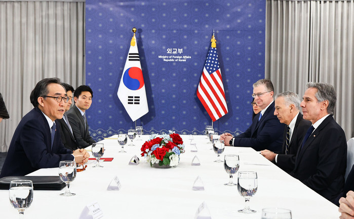 South Korean Foreign Minister Cho Tae-yul (far L) speaks to U.S. Secretary of State Antony Blinken (far R) during their talks at the government complex in Seoul on Jan. 6, 2025. (Pool photo) (Yonhap)