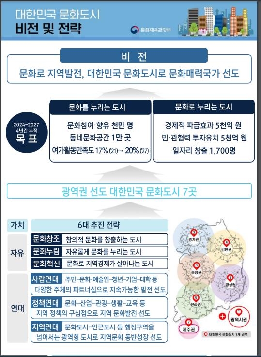 문체부는 자유로운 문화창조·문화누림·문화혁신, 사람·정책·지역 연대 등 6대 추진전략 아래 전국을 7개 권역으로 나눠 7곳의 광역형 선도 도시를 선정하고 2024년부터 2027년까지 4년간 집중 지원한다.