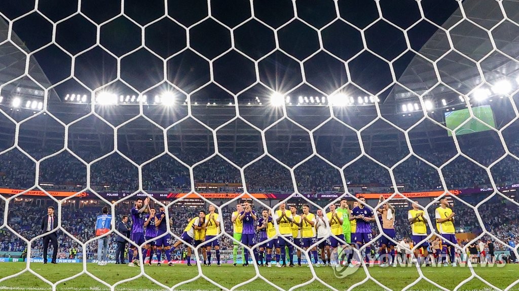 | ▲ 아르헨티나, 조1위로 16강 진출 (도하=연합뉴스) 김도훈 기자 = 30일 오후(현지시간) 카타르 도하 974 스타디움에서 열린 2022 카타르 월드컵 C조 조별리그 3차전 폴란드와 아르헨티나의 경기에서 2-0으로 승리를 거두며 조1위로 16강 진출한 아르헨티나 선수들이 팬들을 향해 인사하고 있다. 2022.12.1 superdoo82@yna.co.kr |