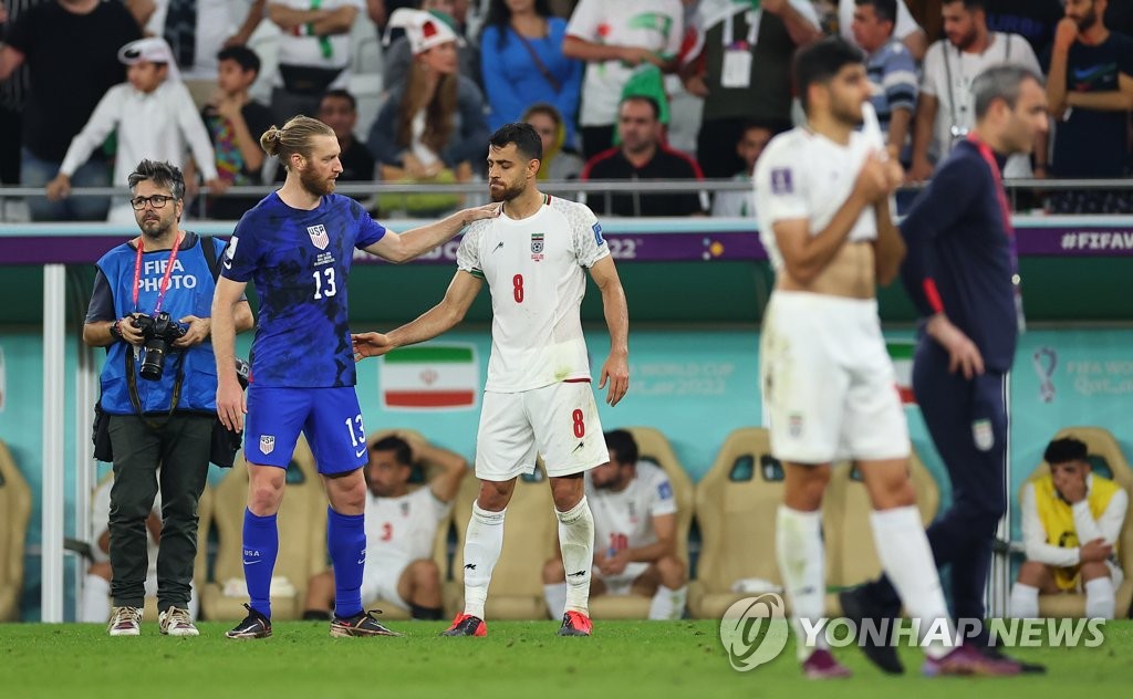 | ▲ 인사 나누는 팀 림과 모르테자 푸르알리간지 (도하=연합뉴스) 김도훈 기자 = 29일 오후(현지시간) 카타르 도하 앗수마마 스타디움에서 열린 2022 카타르 월드컵 B조 조별리그 3차전 이란과 미국의 경기가 끝난 뒤 미국 팀 림(왼쪽)과 이란 모르테자 푸르알리간지가 인사를 나누고 있다. 2022.11.30 superdoo82@yna.co.kr |