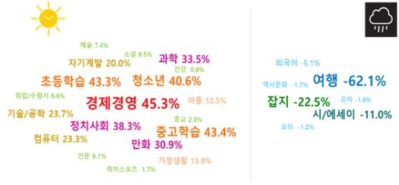 분야별로 보면 지난해 인기를 끌었던 경제·경영서는 전년 대비 판매가 7.9% 감소했고, 판매 점유율도 7.5%까지 줄었다. 아동서는 13.0% 더 팔렸고, 점유율은 8.3%를 기록했다.