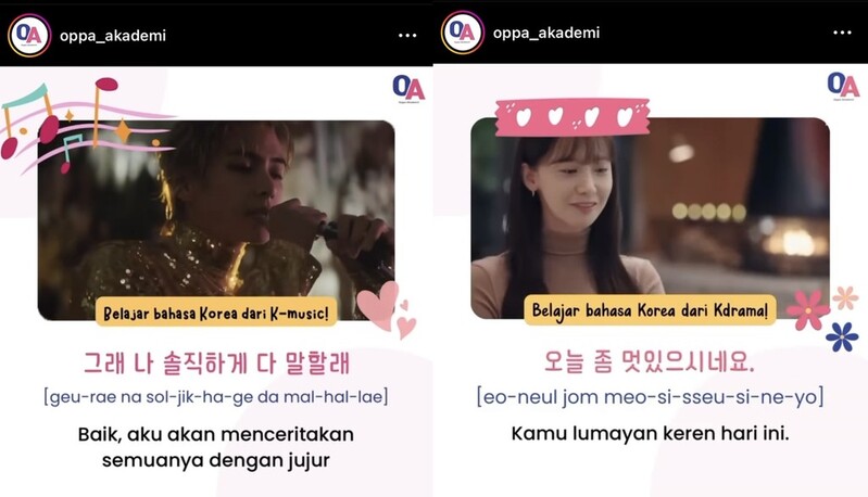 ▲ 한국 가요와 드라마를 활용한 한국어 교육 콘텐츠 ['오빠 아카데미' 인스타그램 게시물 캡처. 재판매 및 DB 금지]