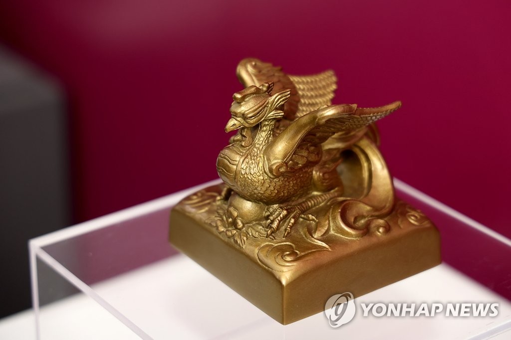 (김해=연합뉴스) 경남 김해시가 21일부터 김영원 작가가 기증한 제3대 국새(國璽·국가 도장) 모형을 시청에 전시한다.