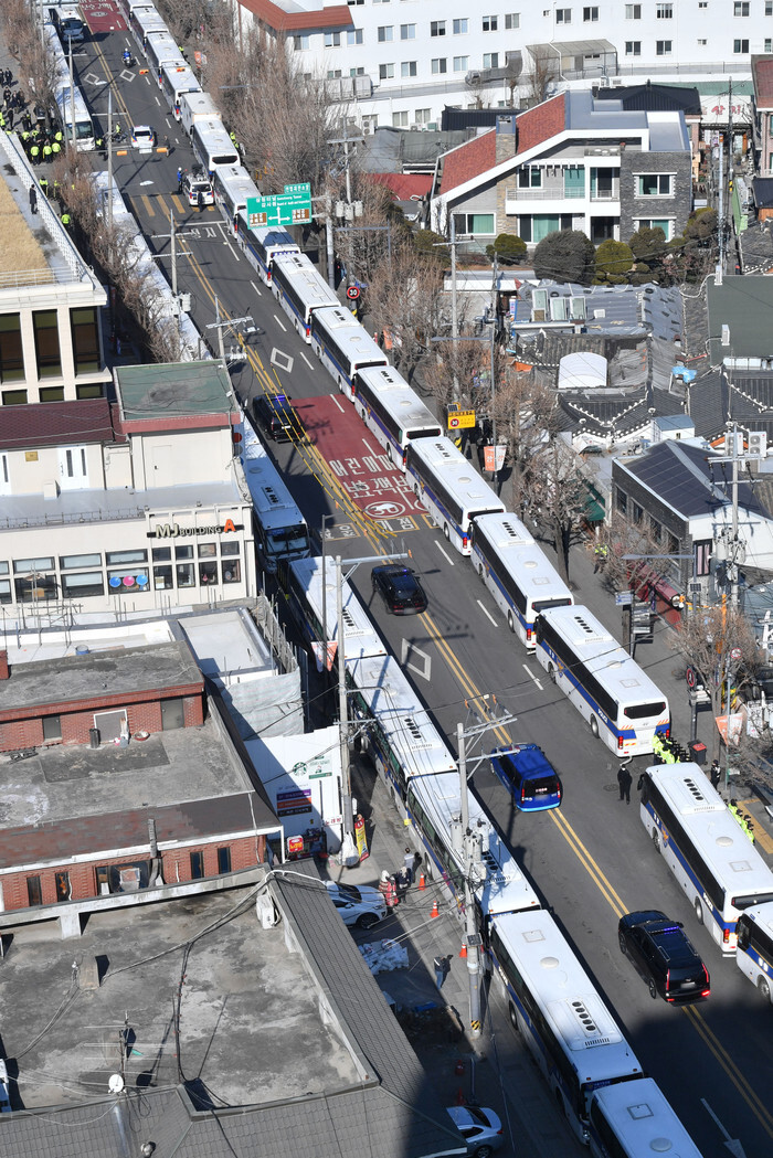 A Ministry of Justice vehicle (blue) carrying arrested President Yoon Suk Yeol drives en route to the Constitutional Court in Seoul on Jan. 23, 2025, as Yoon will attend the fourth hearing of his impeachment trial for his short-lived imposition of martial law in December. (Yonhap)