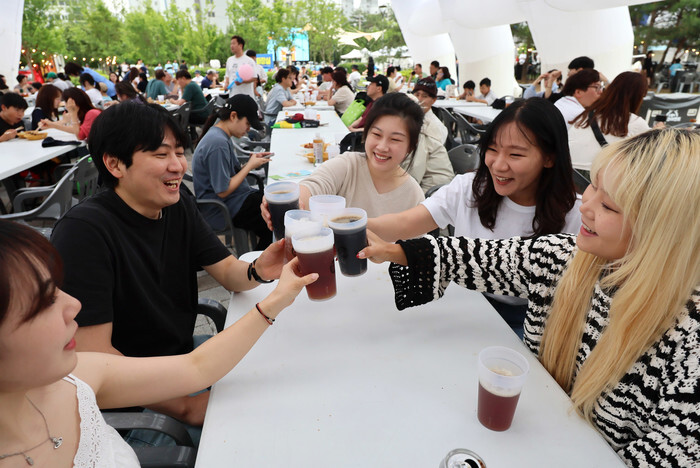 Participants toast during a beer festival held in northern Seoul on May 26, 2024. (Yonhap)