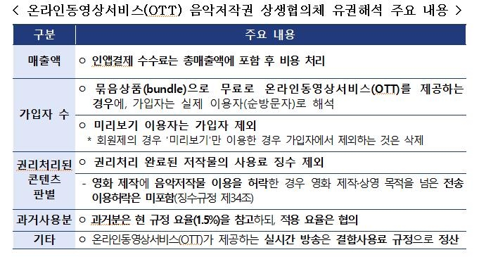 | ▲ 'OTT 음악저작권 상생협의체 유권해석 내용' [문화체육관광부 제공] |
