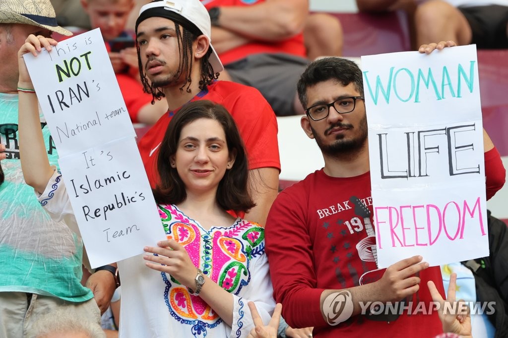 잉글랜드와 1차전이 열린 경기장 관중석에는 이란의 여성 인권 개선을 촉구하는 플래카드가 내걸렸다.