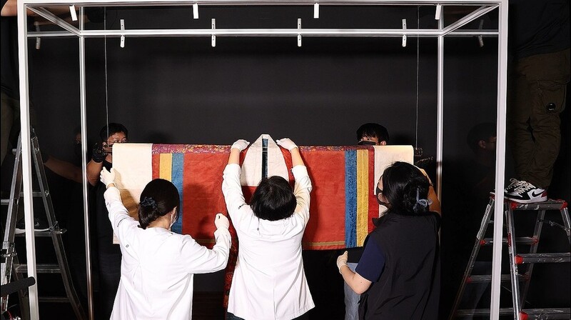 전시를 기획한 조지현 국립고궁박물관 학예연구사는 "지난해 10월에 국내로 들여와 자수 주변 밑단을 정리하고, 전체적인 얼룩과 접착제 등을 제거하는 작업을 거쳤다"고 설명했다.