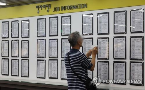 ▲ This file photo taken Aug. 9, 2023, shows a jobseeker looking at a bulletin board at an employment center in Seoul. (Yonhap)