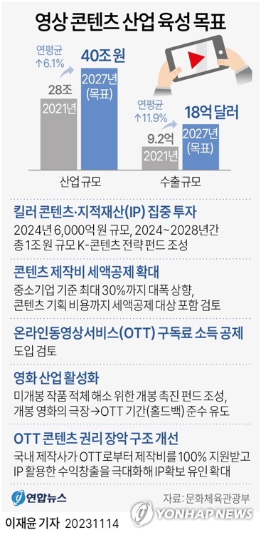 (서울=연합뉴스) 황재하 기자 = 정부가 2021년 28조원 규모였던 영상 콘텐츠 산업의 규모를 40조원 수준으로 키우고 '킬러 콘텐츠'를 창출하기 위해 2028년까지 1조원 규모의 전략펀드를 신설하는 등 장기적 지원에 나선다.