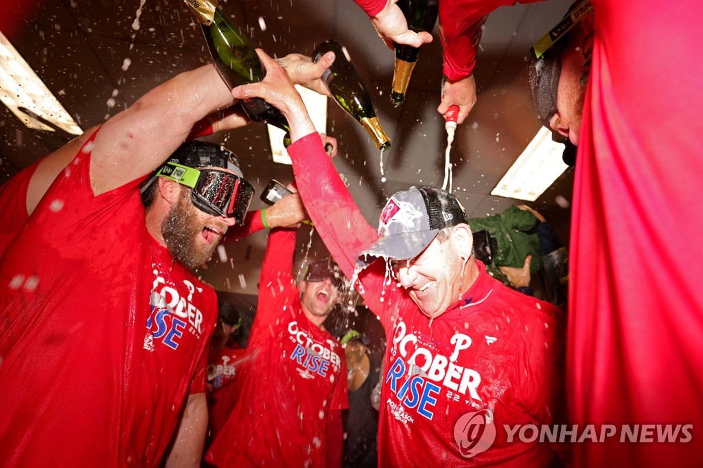 | ▲ 디비전시리즈 진출 후 톰슨 대행에게 맥주를 퍼붓는 MLB 필라델피아 선수들 [게티이미지/AFP=연합뉴스 자료사진] |