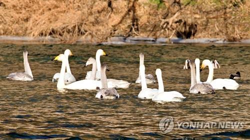 (옥천=연합뉴스) 충북 옥천의 금강을 찾은 겨울 진객 큰고니떼가 장관을 이루고 있다.