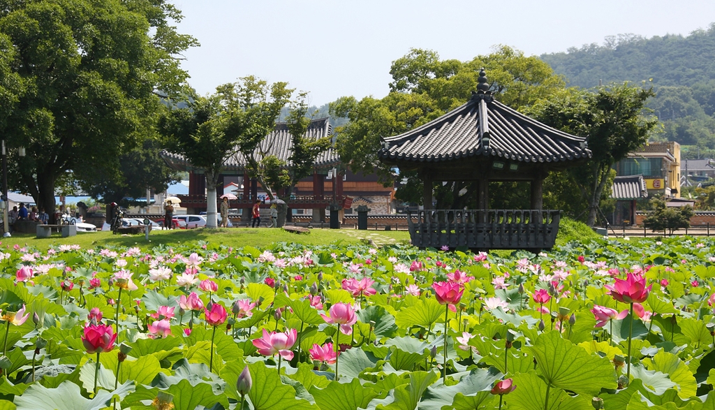 (정읍=연합뉴스) 28일 전북 정읍시 태인면에 있는 피향정(披香亭·보물 제289호) 연못에 연꽃이 만발해 여름 정취를 더하고 있다.