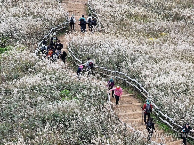 하얀 억새가 드넓게 펴 계절 손님을 맞았고, 등산객들은 금세 스마트폰이나 카메라를 꺼내 장관을 담기 바빴다.