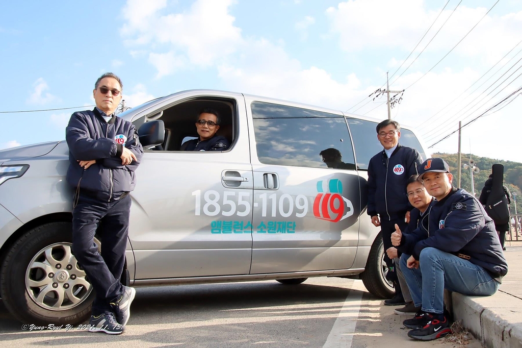 | ▲ "말기 암환자의 꿈을 실어 나릅니다" (서울=연합뉴스) 양정우 기자 = 말기 암환자나 호스피스 환우들의 나들이 꿈을 이뤄주는 '앰뷸런스 소원재단'이 출범했다. 13일 첫 봉사로 말기 암환자를 싣고서 인천 바닷가를 찾은 재단 관계자 등이 함께 기념촬영을 했다. 2021.11.14 eddie@yna.co.kr (끝) |
