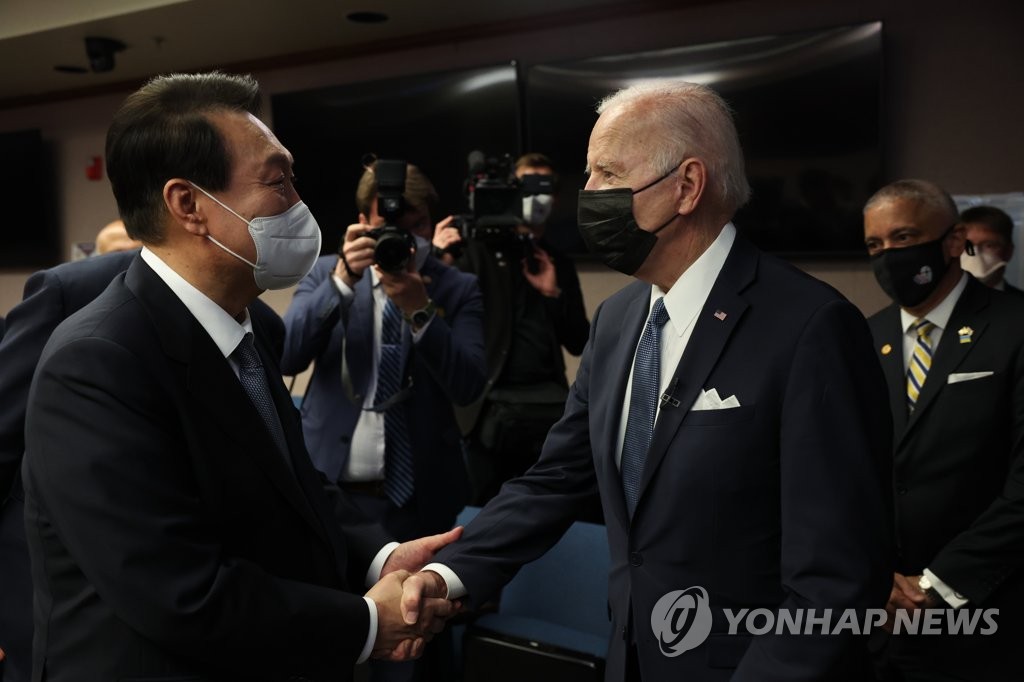 | ▲ President Yoon Suk-yeol (L) and U.S. President Joe Biden shake hands during a visit to the Korea Air and Space Operations Center in Pyeongtaek, 70 kilometers south of Seoul, on May 22, 2022. (Yonhap) |
