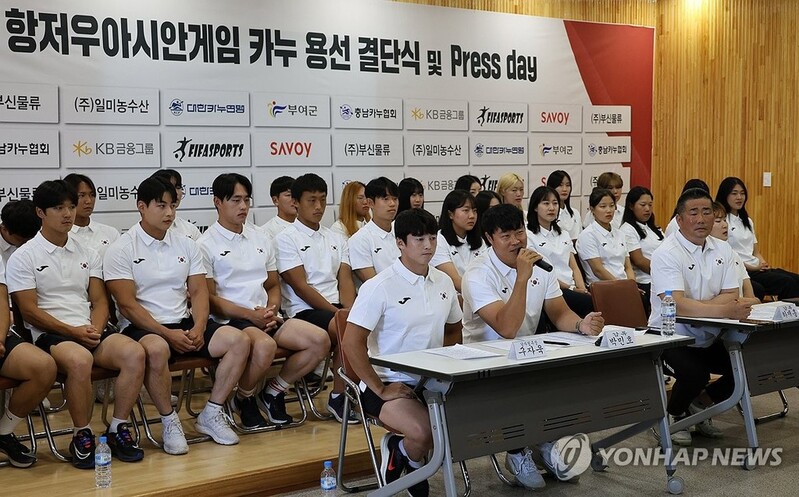 ▲ Members of the South Korean men's and women's dragon boat teams for the Asian Games attend a press conference in the central county of Buyeo on Sept. 7, 2023. (Yonhap)