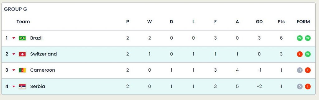 | ▲ 2022 카타르 월드컵 G조 중간순위(30일 현재) [FIFA 홈페이지 캡처. 재판매 및 DB 금지] |