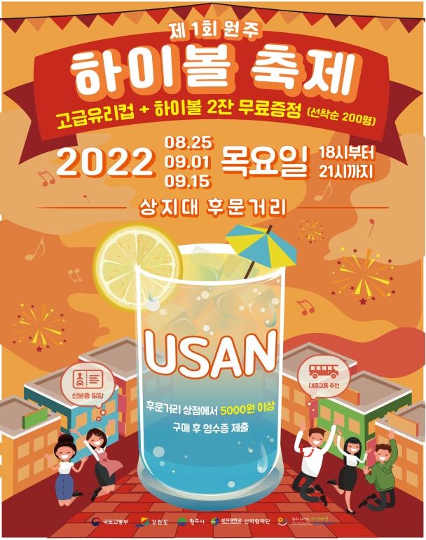 원주시 우산동 도시재생현장지원센터는 오는 25일 오후 6시 상지대 후문 앞 거리에서 제1회 원주 하이볼 축제를 개최한다고 17일 밝혔다.