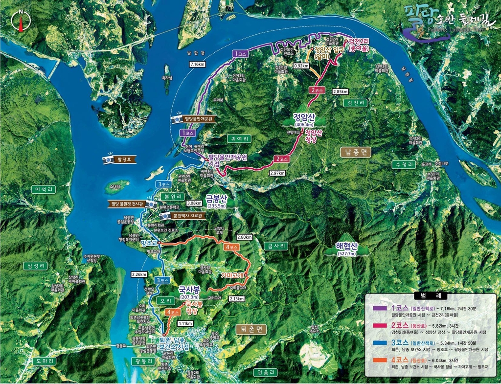 이 둘레길은 팔당호를 바라보는 호숫길 평지 구간과 정암산을 등반하는 산지 구간을 연결한 도보 여행길로 이뤄졌다.