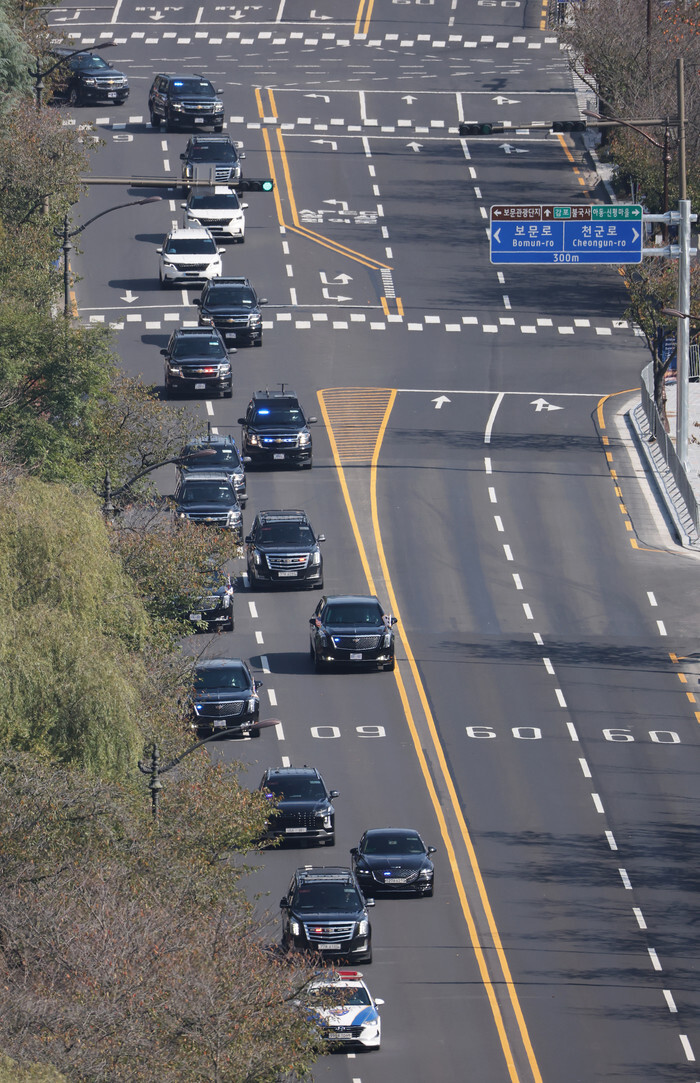 A motorcade carrying U.S. President Donald Trump heads down a road in Gyeongju, North Gyeongsang Province, southeastern South Korea, on Oct. 29, 2025, as he travels to the Gyeongju Arts Center to take part in the CEO Summit of the Asia-Pacific Economic Cooperation forum. (Yonhap)