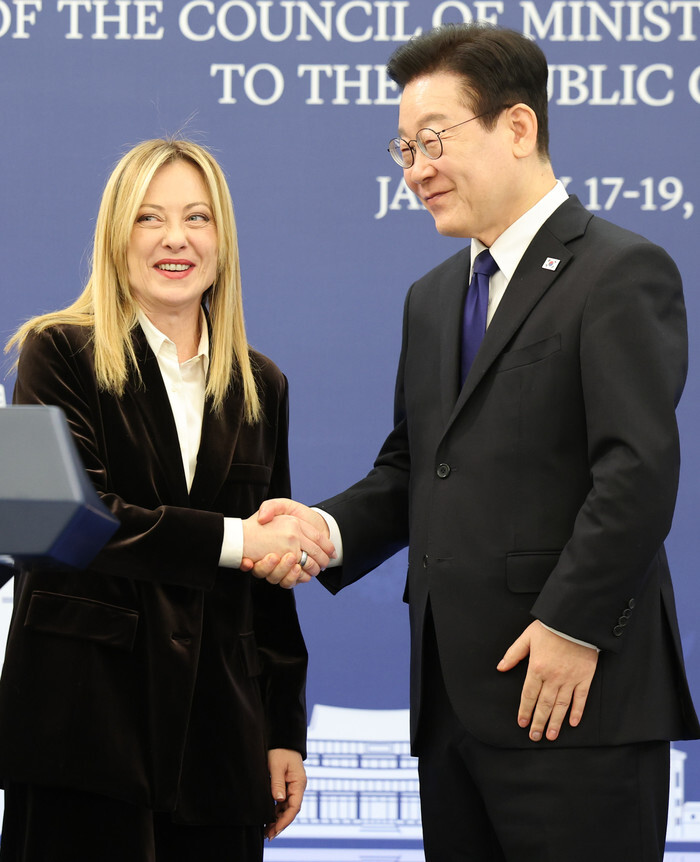 South Korean President Lee Jae Myung (R) and Italian Prime Minister Giorgia Meloni shake hands after attending a joint press conference following their talks at the presidential office Cheong Wa Dae in Seoul on Jan. 19, 2026. (Yonhap)