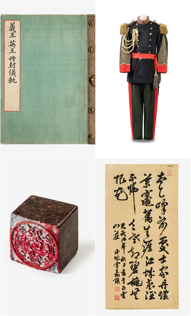 | ▲ 주요 전시품 왼쪽 위부터 시계방향으로 '의왕영왕책봉의궤', 대한제국 육군부장 예복, 제국익문사 인장, 조선민족대동단 총재 김가진이 의친왕에게 써 준 글씨. [경운박물관 제공. 재판매 및 DB 금지] |
