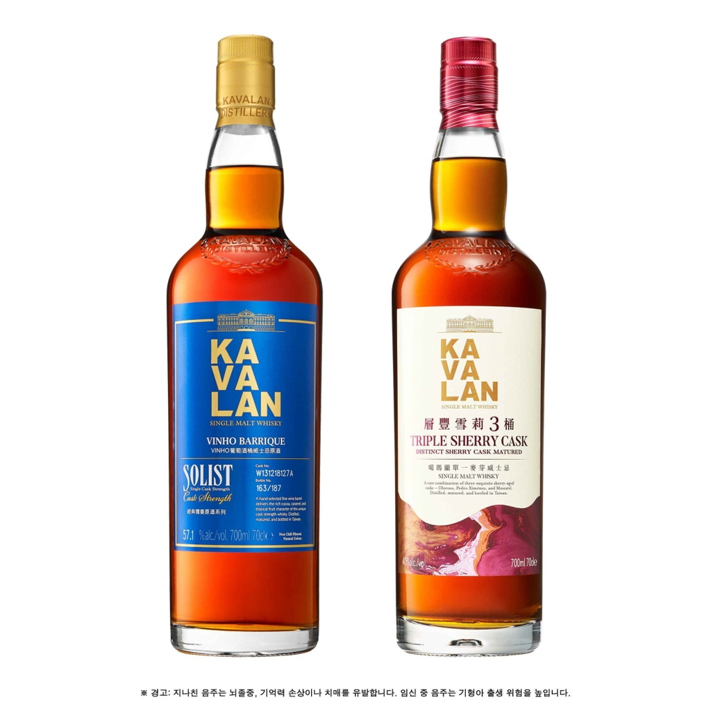 ▲ 골든블루 인터내셔널은 타이완 싱글몰트 위스키 '카발란'(Kavalan) 제품 2종을 내수 시장에 선보인다고 10일 밝혔다. 새롭게 선보이는 제품은 '카발란 트리플 쉐리 캐스크 싱글몰트'와 '카발란 솔리스트 비노바리끄 싱글 캐스크 스트렝스 싱글몰트'다. '카발란 솔리스트 비노바리끄 싱글 캐스크 스트렝스 싱글몰트'는 면세점에서만 구매할 수 있었으나 소비자의 높은 관심으로 판매 채널 확대를 결정했다. '카발란'은 위스키 시장에 새로운 트렌드를 제시하며 국내 시장에서 수요가 증가하고 있다. 지난해 내수용과 면세점 판매량은 전년 대비 각각 169%, 115% 증가했다. (부산=연합뉴스)