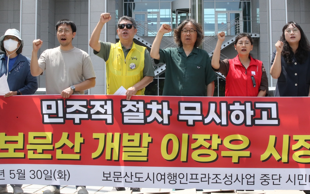 (대전=연합뉴스) 강수환 기자 = 보문산 개발 중단을 위한 시민단체 연합이 30일 오전 대전시청 앞에서 기자회견을 열고 "이장우 대전시장은 보문산 개발계획 전부를 철회하고 민주적 절차에 따른 의견 수렴 결과를 존중하고 이행하라"고 촉구했다.