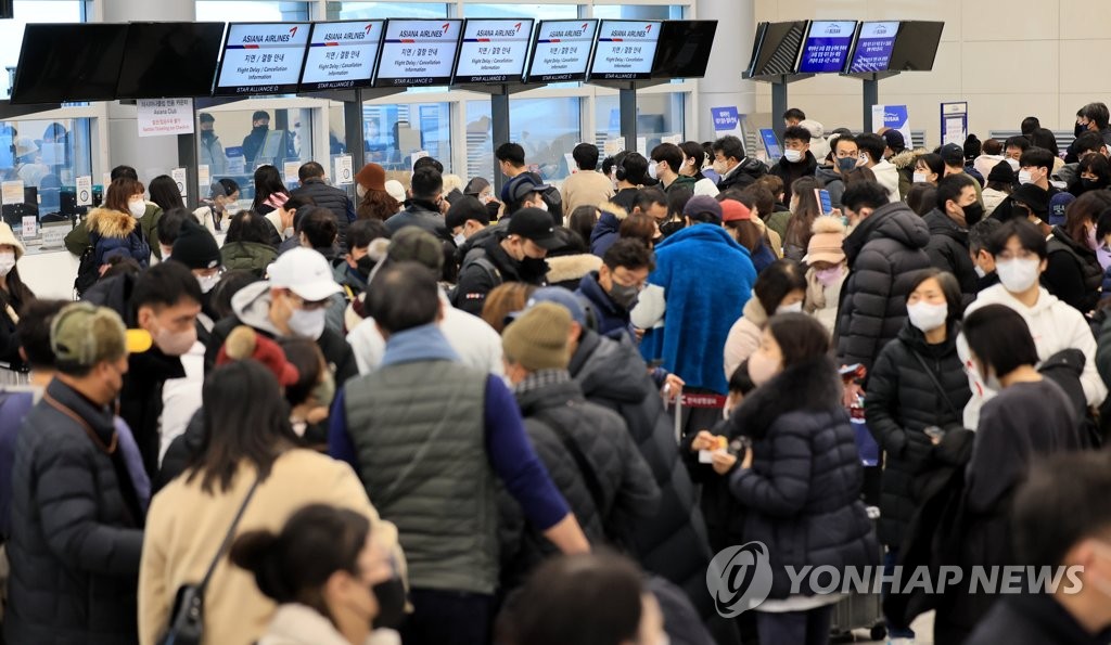Jeju airport was crowded with travelers waiting to book new plane tickets to return home on the last day of the Lunar New Year holiday.