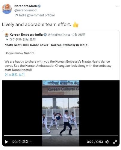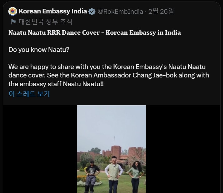 The 53-second video uploaded Sunday, featuring embassy staff dancing to the energetic song "Naatu Naatu" from the 2022 Indian epic action drama, had racked up over 3.7 million views as of 1 p.m. Monday (Korean time).