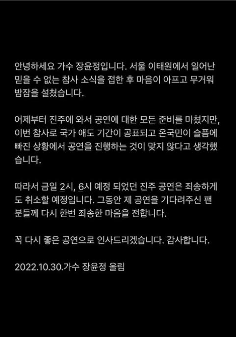가수 장윤정은 이날 오후 2시와 6시에 예정됐던 진주 공연 취소를 알리며 참사 피해자들에게 추모의 메시지를 보냈다.