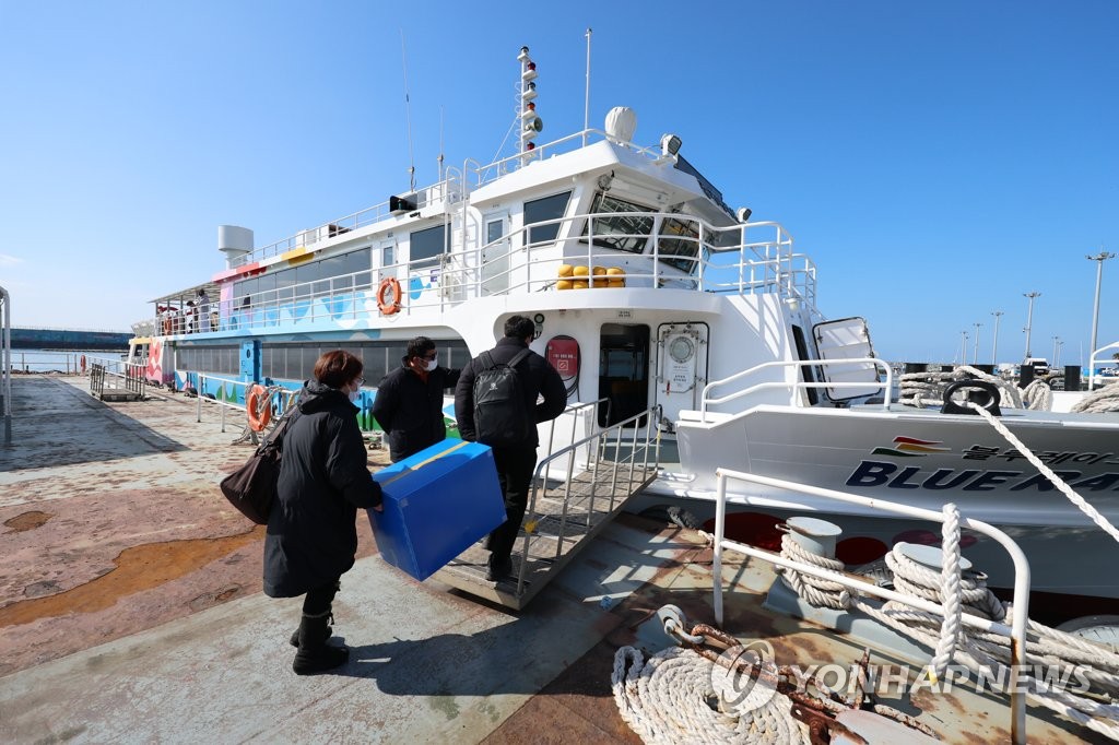| ▲ 마라도 길고양이 반출 사전작업 개시 (서귀포=연합뉴스) 박지호 기자 = 멸종위기에 처한 천연기념물 뿔쇠오리를 위협한다는 지적을 받는 마라도 길고양이 반출을 위한 사전 작업이 27일 시작됐다. 제주도 세계유산본부 관계자들이 이날 오전 서귀포시 대정읍 운진항에서 마라도행 여객선에 탑승하고 있다. 2023.2.27 jihopark@yna.co.kr |