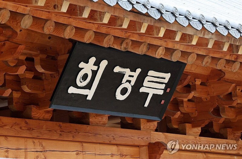 (광주=연합뉴스) 손상원 기자 = 새로 지어진 광주 대표 누각 희경루 현판을 강기정 광주시장의 서체로 제작해 논란이 일고 있다.