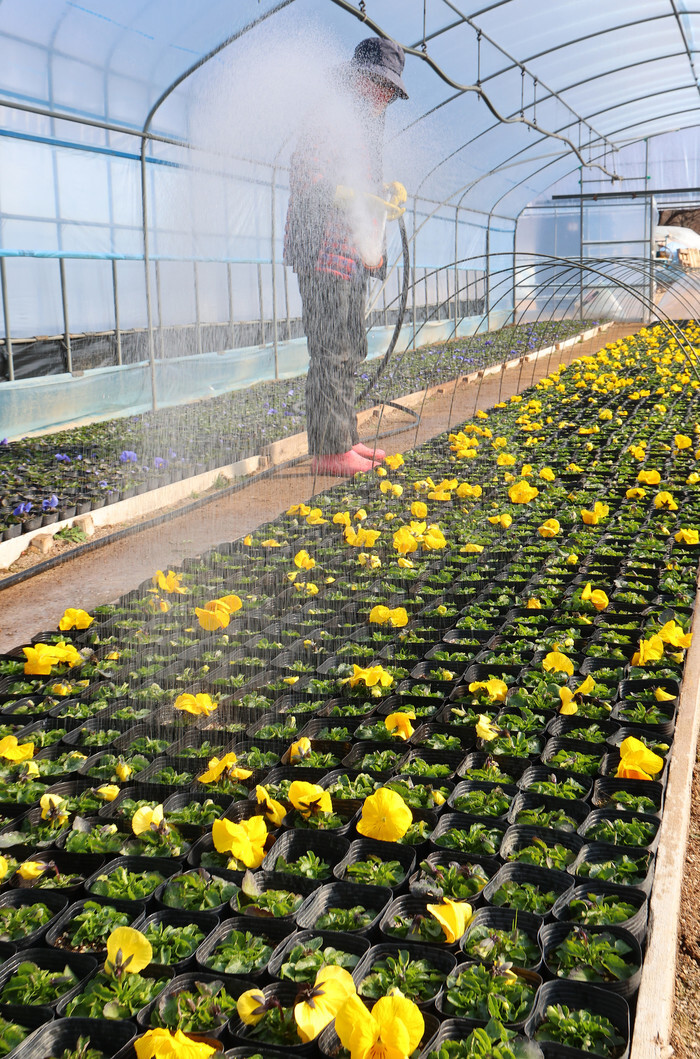 A worker waters a variety of flowers at a nursery in Incheon, west of Seoul, on Feb. 3, 2025, which will be planted along the region's streets for spring. (Yonhap)