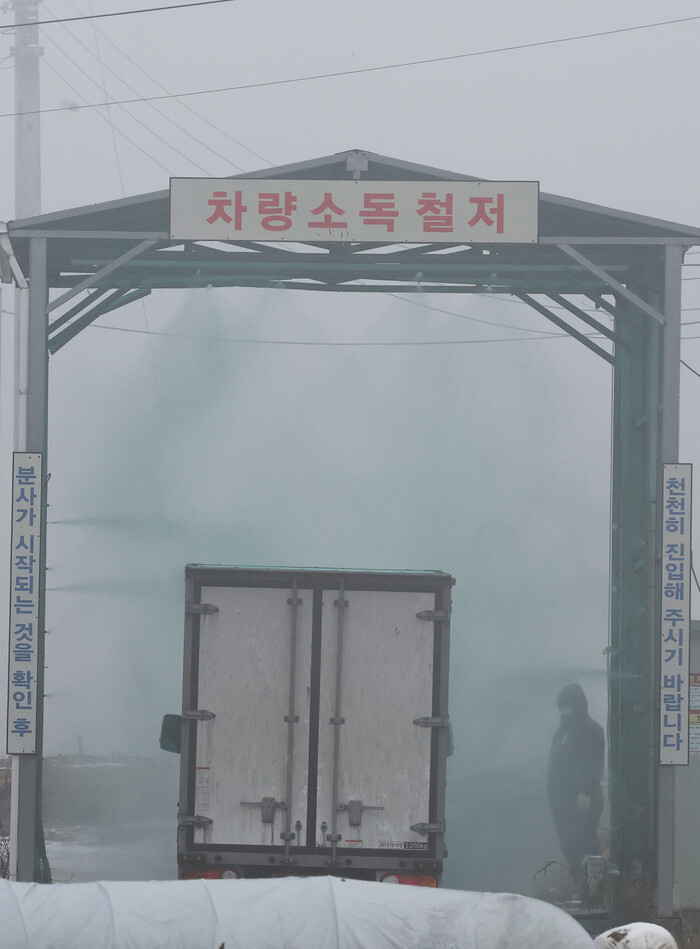 A quarantine official disinfects a vehicle on a road near an egg farm in Yeoju, about 65 kilometers east of Seoul, on Jan. 6, 2025, one day after the government confirmed its 20th case of highly pathogenic avian influenza for this winter season there. (Yonhap)