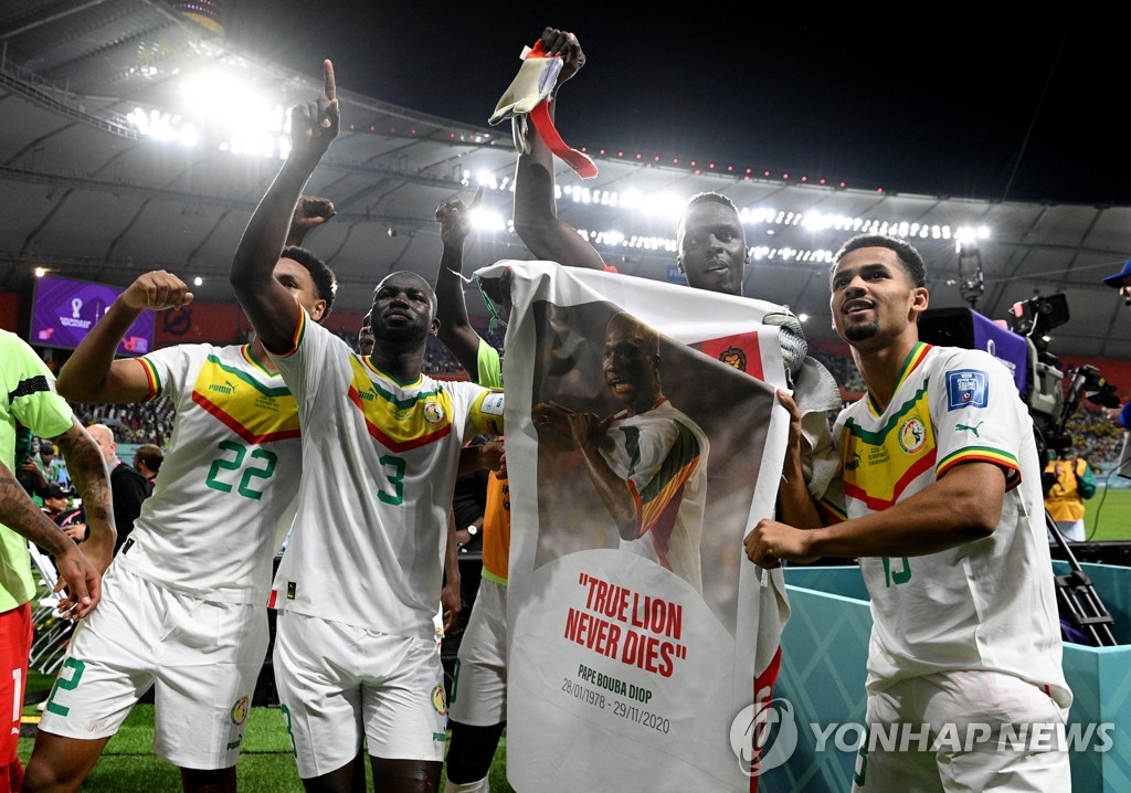 | ▲ 디오프를 추모하는 세네갈 선수들 (알라이얀[카타르] AP=연합뉴스) 세네갈 선수들이 29일(현지시간) 카타르 알라이얀의 칼리파 인터내셔널 스타디움에서 열린 2022 카타르 월드컵 에콰도르와의 A조 3차전에서 승리해 16강 진출을 확정한 뒤, 디우프를 추모하는 현수막을 들고 세리머니를 펼치고 있다. |