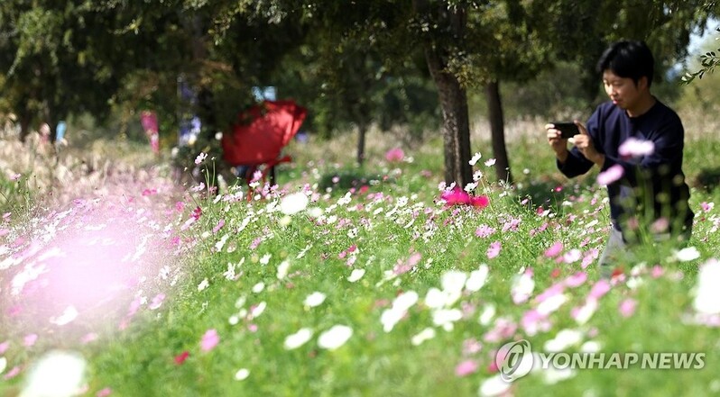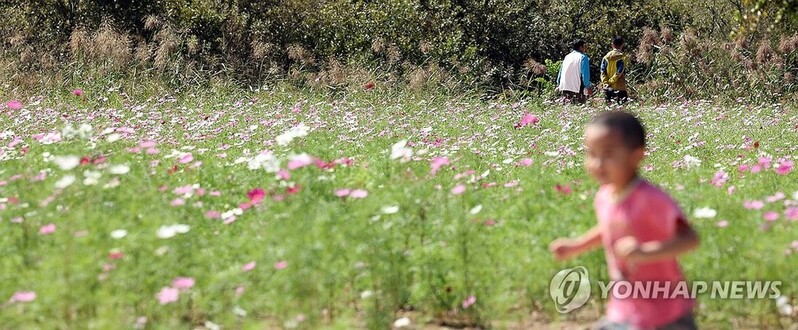 (밀양=연합뉴스) 김동민 기자 = 절기 한로를 이틀 앞둔 6일 경남 밀양시 초동면 초동 코스모스 연가길에 코스모스가 활짝 펴 시선을 끈다.