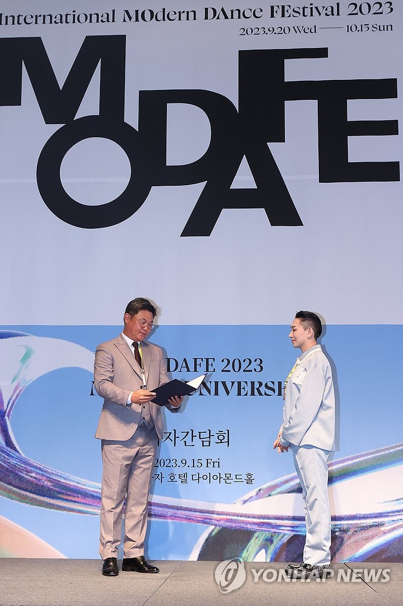 | ▲ 국제현대무용제 질의응답 (서울=연합뉴스) 강민지 기자 = 15일 서울 중구 더플라자호텔에서 열린 제42회 국제현대무용제(MODAFE 2023) 기자간담회에서 이해준 조직위원장이 취재진의 질문에 답하고 있다.왼쪽은 홍보대사로 위촉된 배우 김호영. 2023.9.15 mjkang@yna.co.kr |