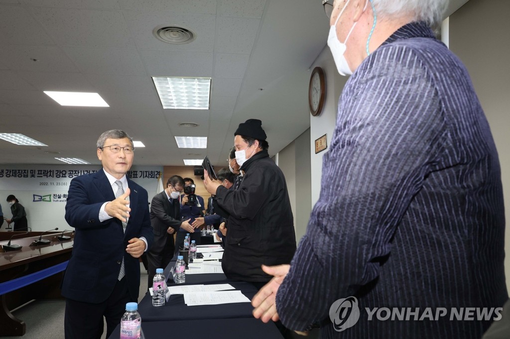 | ▲ 진실화해위, 대학생 강제징집 피해자 위로 (서울=연합뉴스) 한상균 기자 = 23일 서울 중구 진실화해위원회에서 정근식 위원장이 '대학생 강제징집 및 프락치 강요 공작사건' 피해자들을 위로하고 있다. 진실화해위는 이날 관련 사건 진실규명 결정을 발표했다. 2022.11.23 xyz@yna.co.kr |