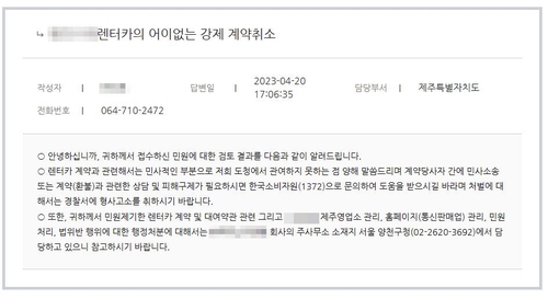 ▲ 제주도청 인터넷 신문고에 오른 민원 (제주=연합뉴스) 제주도 인터넷 신문고에 오른 렌터카 문제 관련 민원에 대해 제주도청이 처분 권한이 없다며 업체의 주사무소 소재지인 서울 양천구청에 문의하라는 취지의 답변을 하고 있다. 2023.5.4 [제주도청 인터넷 신문고 갈무리, 재판매 및 DB 금지]