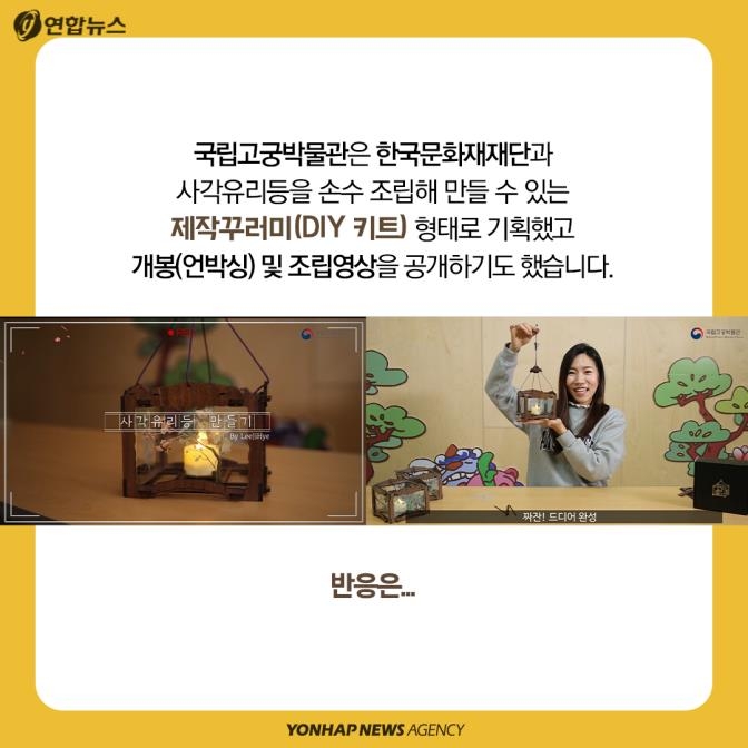 국립고궁박물관과 한국문화재재단은 사각유리등을 손수 조립해 만들 수 있는 제작꾸러미(DIY 키트) 형태로 기획했고 개봉(언박싱) 및 조립영상을 공개하기도 했습니다.