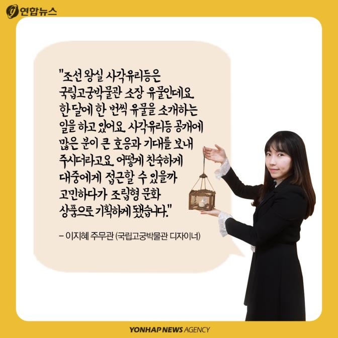 "조선 왕실 사각유리등은 국립고궁박물관 소장 유물인데요. 한 달에 한 번씩 유물을 소개하는 일을 하고 있어요. 사각유리등 공개에 많은 분들이 큰 호응과 기대를 보내주시더라고요. 어떻게 친숙하게 대중에게 접근할 수 있을까 고민하다가 조립형 문화상품으로 기획하게 됐습니다."