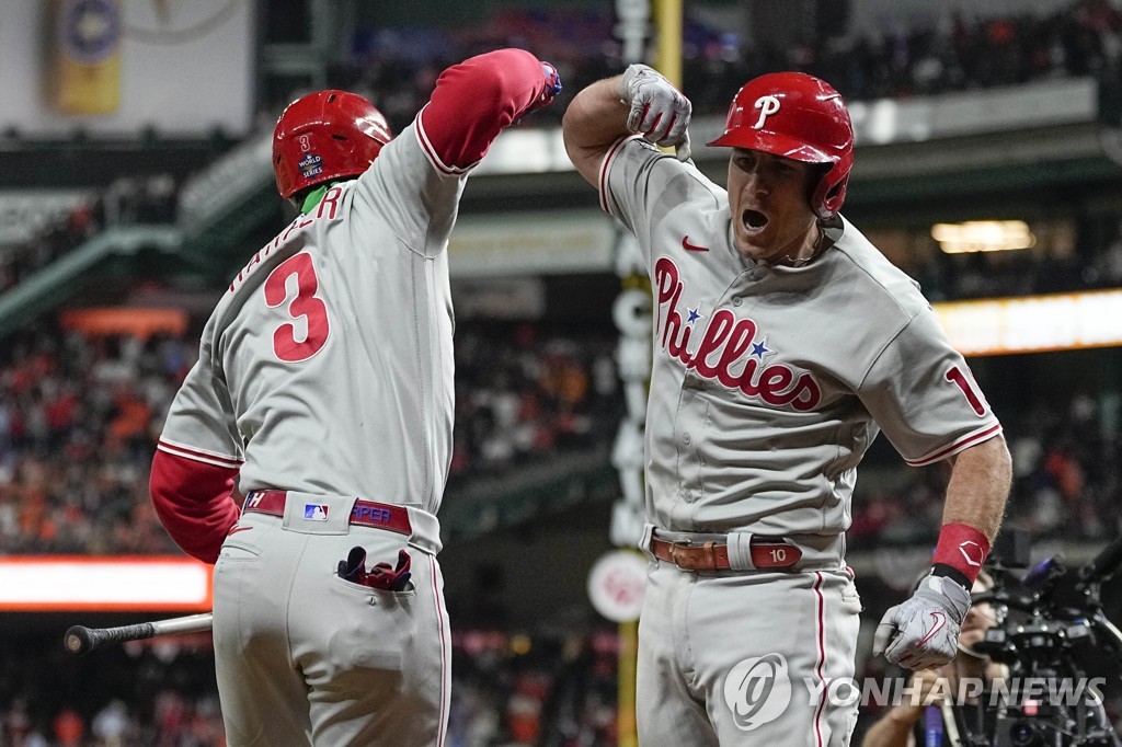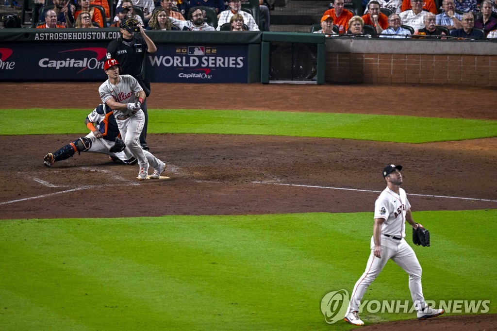 필라델피아는 29일(한국시간) 미국 텍사스주 휴스턴의 미닛메이드파크에서 열린 2022 미국프로야구 메이저리그(MLB) 월드시리즈(WS) 1차전에서 휴스턴을 연장 혈전 끝에 6-5로 꺾었다.
