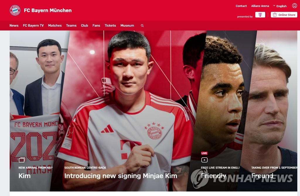 | ▲ 축구 국가대표 수비수 김민재, 독일 바이에른 뮌헨과 5년 계약 (서울=연합뉴스) 축구 국가대표 수비수 김민재가 독일 분데스리가 바이에른 뮌헨과 5년간 계약했다. 바이에른 뮌헨은 19일 구단 인터넷 홈페이지를 통해 "한국 국가대표 수비수로 지난 시즌 나폴리에서 뛴 김민재와 2028년 6월 30일까지 5년간 계약했다"며 "김민재의 등번호는 3번"이라고 발표했다. 바이에른 뮌헨 구단의 공식 홈페이지를 장식한 김민재의 입단 모습. 2023.7.19 [바이에른 뮌헨 구단 홈페이지 캡처. 재판매 및 DB 금지] photo@yna.co.kr |