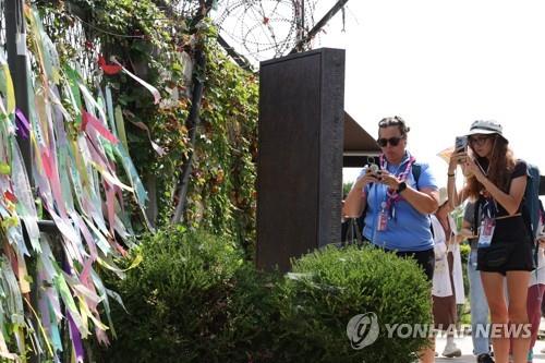 | ▲ 파주 DMZ 찾은 잼버리 대표단 (파주=연합뉴스) 임병식 기자 = 9일 경기도 파주시 임진각에서 세계 스카우트 잼버리 그리스 대표단이 민간인통제선 철책에 달린 평화 기원 리본을 살펴보고 있다. 태풍 '카눈'의 북상으로 2023 새만금 세계 스카우트 잼버리에서 조기 퇴영한 각국 대표단들은 이날부터 문화관광 투어를 시작한다. 2023.8.9 |