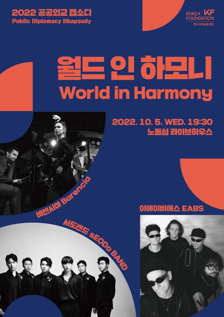 한국국제교류재단(KF·이사장 김기환)은 오는 11월 중순 예정된 '제5회 공공외교주간' 사전 이벤트로 내달 5일 오후 7시 30분 노들섬 라이브하우스에서 '2022 공공외교-월드 인 하모니' 공연을 개최한다고 28일 밝혔다.