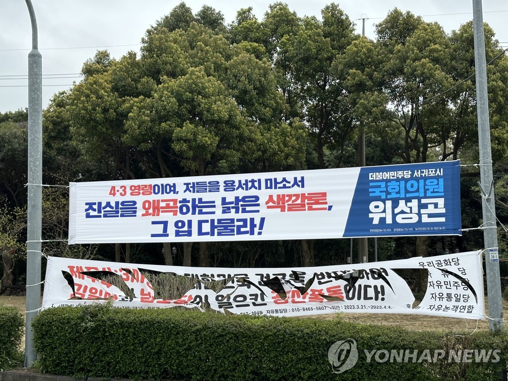 제주에서는 최근 "제주4·3 사건은 대한민국 건국을 반대하여 김일성과 남로당이 일으킨 공산폭동이다"는 주장을 담은 현수막이 우리공화당 등의 명의로 80여곳에 내걸렸다.